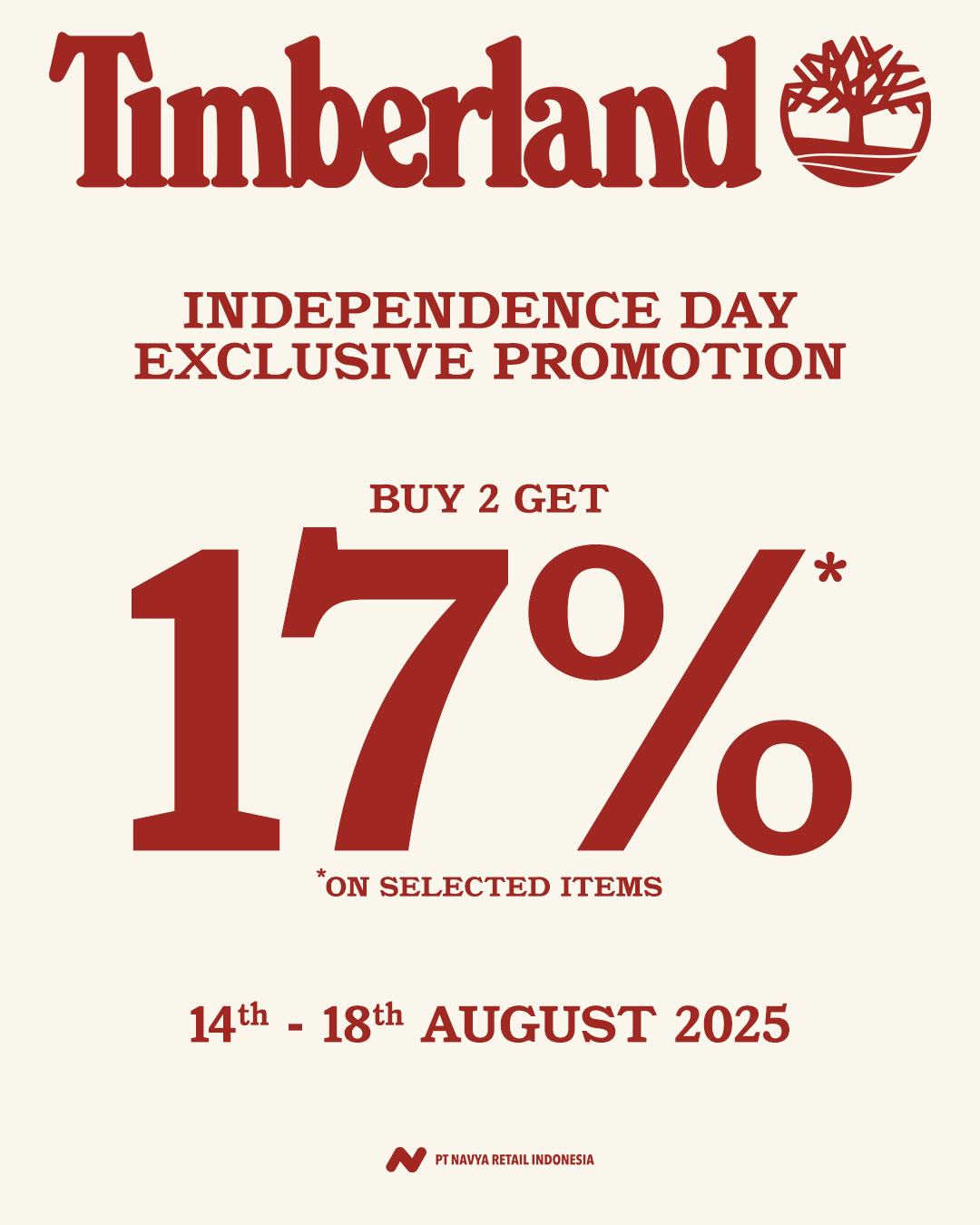 Buat momen 17-an makin keren bareng koleksi pilihan Timberland! Dapatkan koleksi outfit outdoor yang elegan dan kece dengan harga spesial! Beli 2 item atau lebih, langsung dapet diskon 17%. Kapan lagi kan?