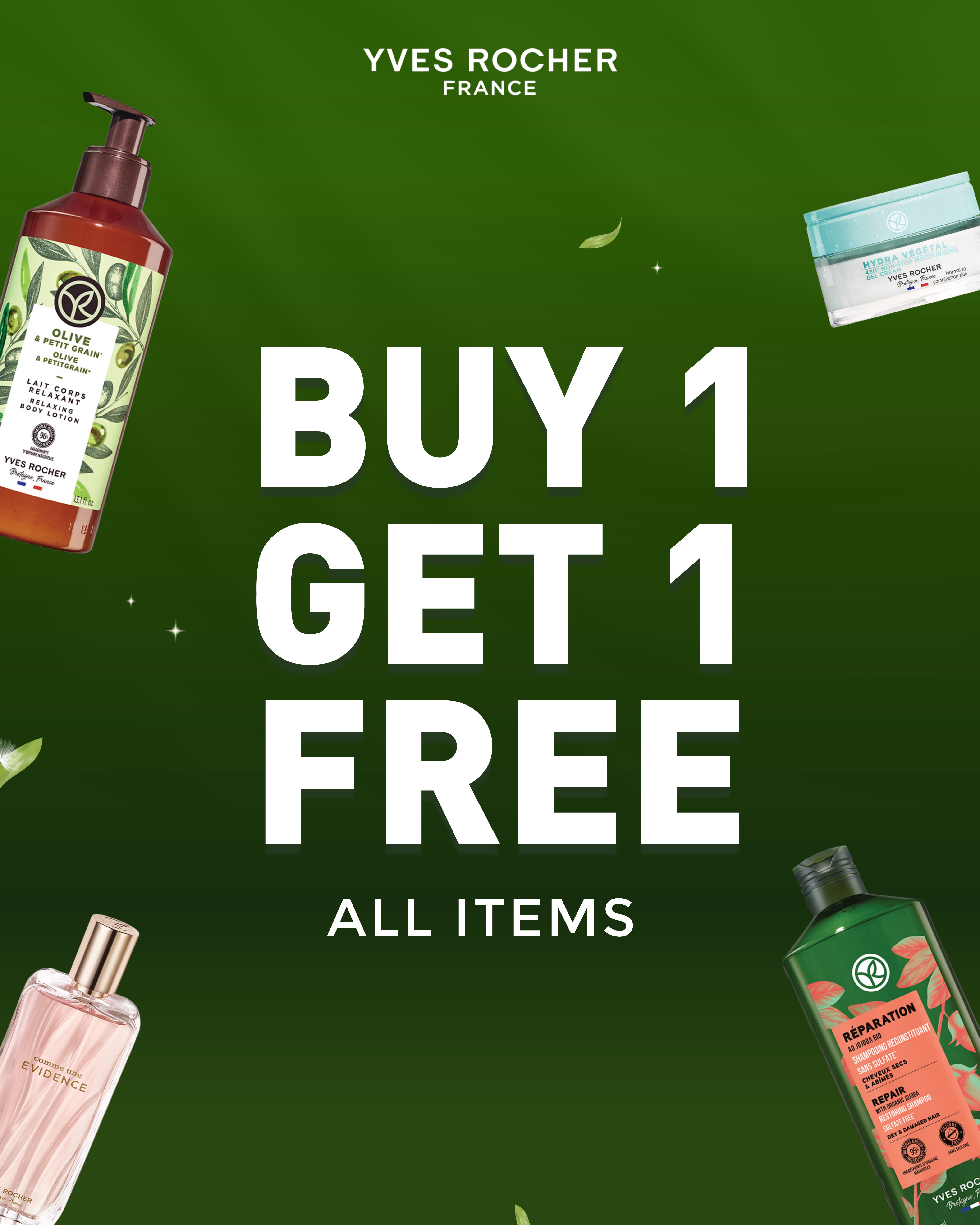Buy 1 Get 1 Free on ALL ITEMS at Yves Rocher boutiques