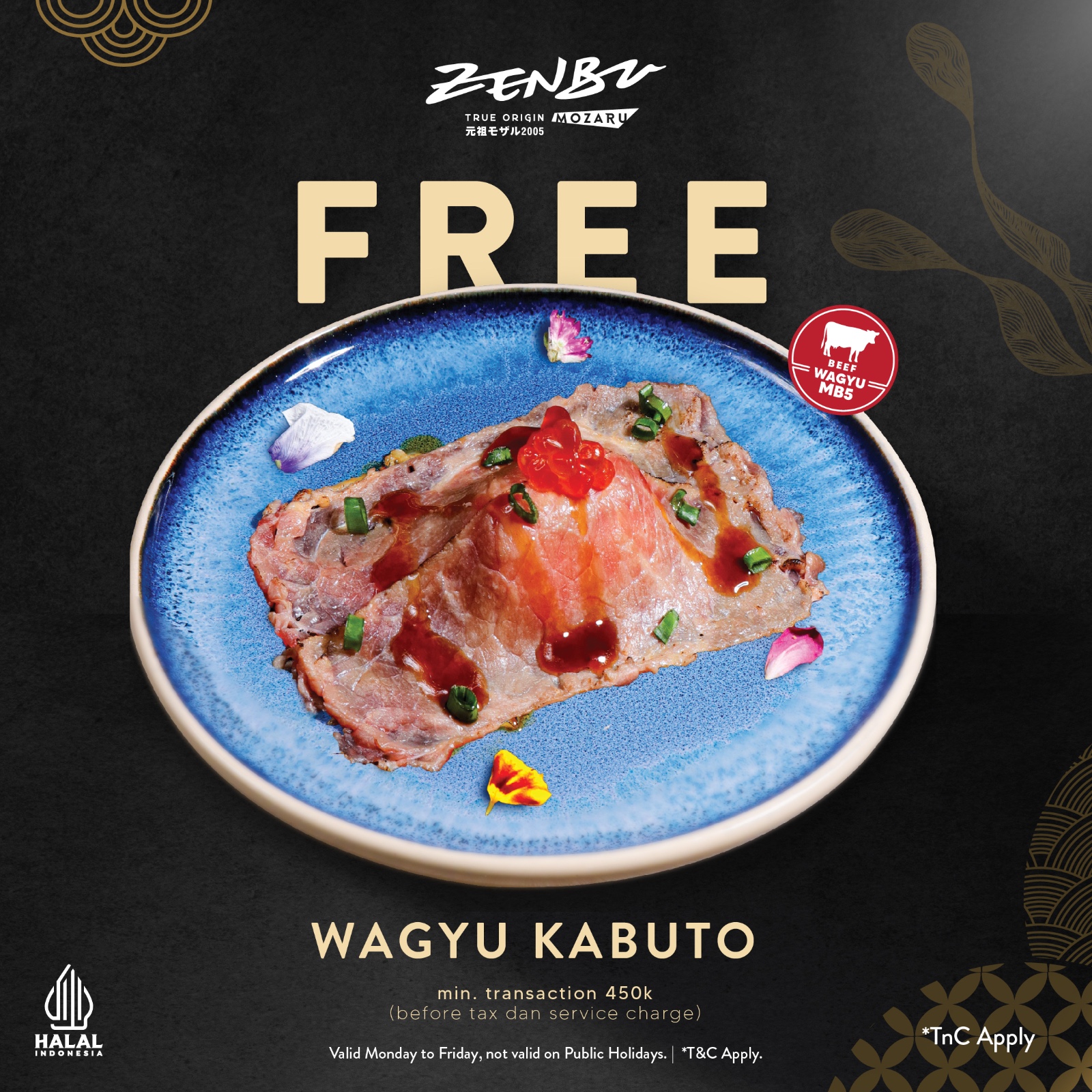 ✨ Nikmati sensasi lembut dan mewahnya Wagyu Kabuto GRATIS dengan minimal transaksi 450K! ? Sempurnakan pengalaman bersantap kamu di Zenbu, hanya dari Senin - Jumat. Jangan lewatkan kesempatan emas ini, ayo ajak teman atau keluarga dan rasakan Wagyu terbaik dari kami!
